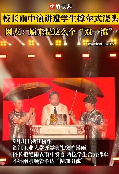 9月3日晚,浙江工业大学举行2025级本科生开学典礼。有网友发布视频称,当晚突降大雨,2名学生上去给正在演讲的校长撑伞,却正好把两把雨伞之间的空隙留给了校长,这个画面被网友戏称为“双一流”。随后,你说“双一流原来是这么个双一流”登上热搜引关注。记者联系上了一名参与典礼的新生,他说,刚下雨的时候其实有老师给校长递雨衣,但是校长拒绝了,后来雨越来越大,就有2名参...