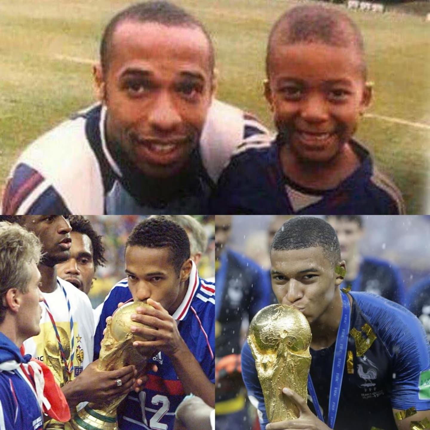 亨利贴出一组图片,有他和童年时期的姆巴佩的合影,也有两人以非常接近的姿势亲吻世界杯冠军奖杯的画面。还有两人进球后围绕角旗杆庆祝的画面。